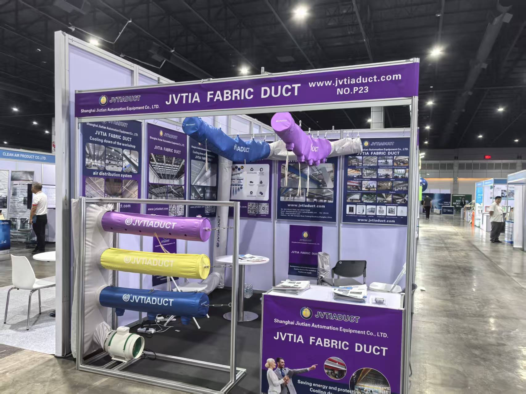 展会期间,九田公司精心布置的展位以其专业、现代的设计风格,吸引了大量专业观众、行业专家、工程商及采购商的驻足参观与深入交流。公司重点展示了其核心产品线——纤维织物风管系统及其相关配套解决方案。纤维织物风管作为一种新型的通风末端送风装置,以其材质轻柔、送风均匀、安装便捷、美观大方、易于清洁维护等诸多优势,正逐步成为替代传统金属风管的重要选择,在商业建筑、工业厂房、体育场馆、数据中心、洁净车间及农业温室等多元化应用场景中展现出巨大的市场潜力。